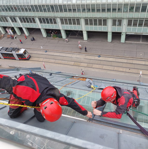 Hier sehen Sie ganz aktuelle Fotos über den Wechsel eines Dachflächenfensters samt Markise auf einem 35m hohen Hochhaus in Wien: